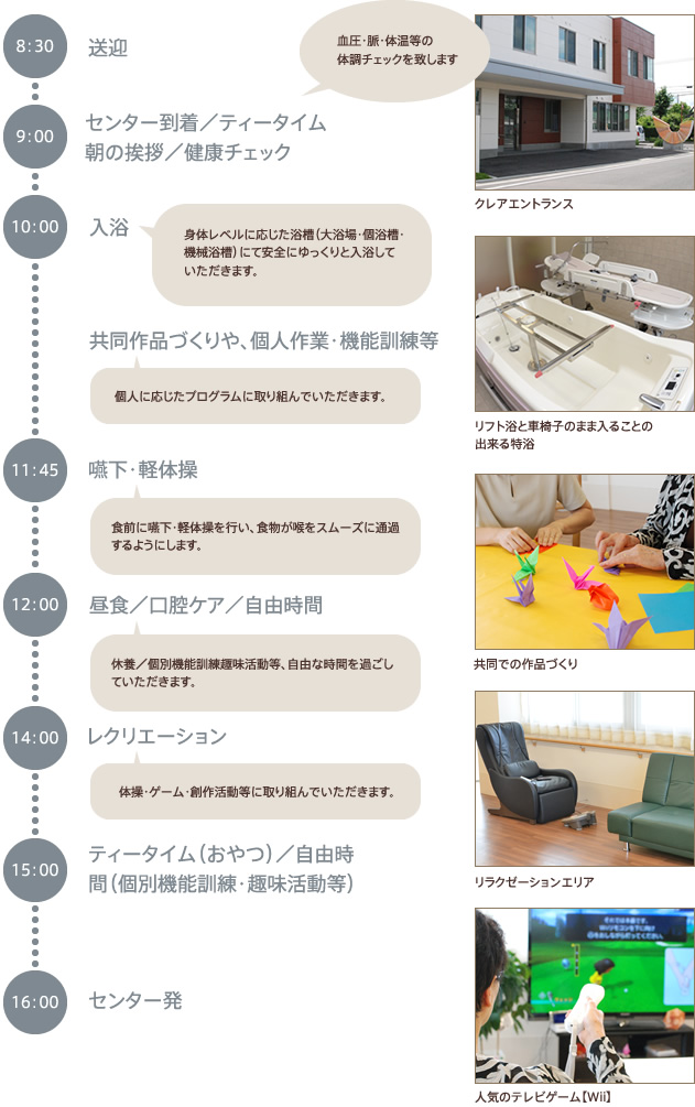 | 利用料金 | 通所介護費・介護予防通所介護費自己負担分 昼食代(1日あたり390円) 活動費(必要に応じて自己負担分をいただく場合がございます。) |