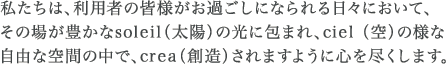 これからも現状に満足すること無く、より良いサービス、よりきめ細かい対応をスタッフと一緒に目指していきたいと思っております。私達住宅型有料老人ホームソレイユをどうかよろしくお願い致します。
